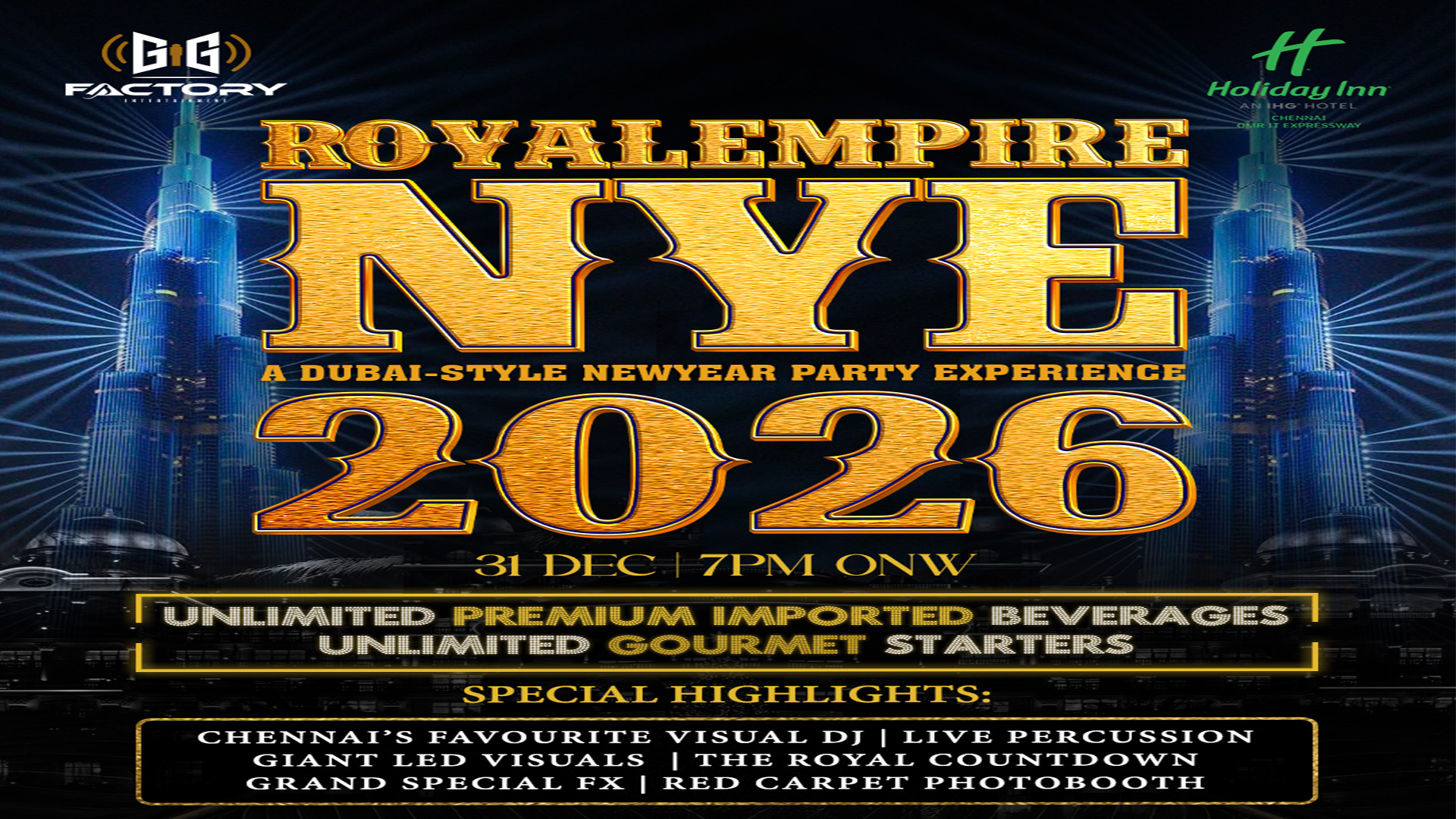 ROYAL EMPIRE NYE 2026A DUBAI STYLE NEW YEAR PART EXPERIENCEDate: 31st Dec / Wed / 7pm onwardsVenue: HOLIDAY INN OMRSpecial Acts:● Chennai’s Favourite Visual DJ ● Live Percussion (Durbuka) ● Giant LED Visuals ● The Royal Countdown ● High-impact Grand Special FX ● Luxe golden Shower ● Red Carpet Photo