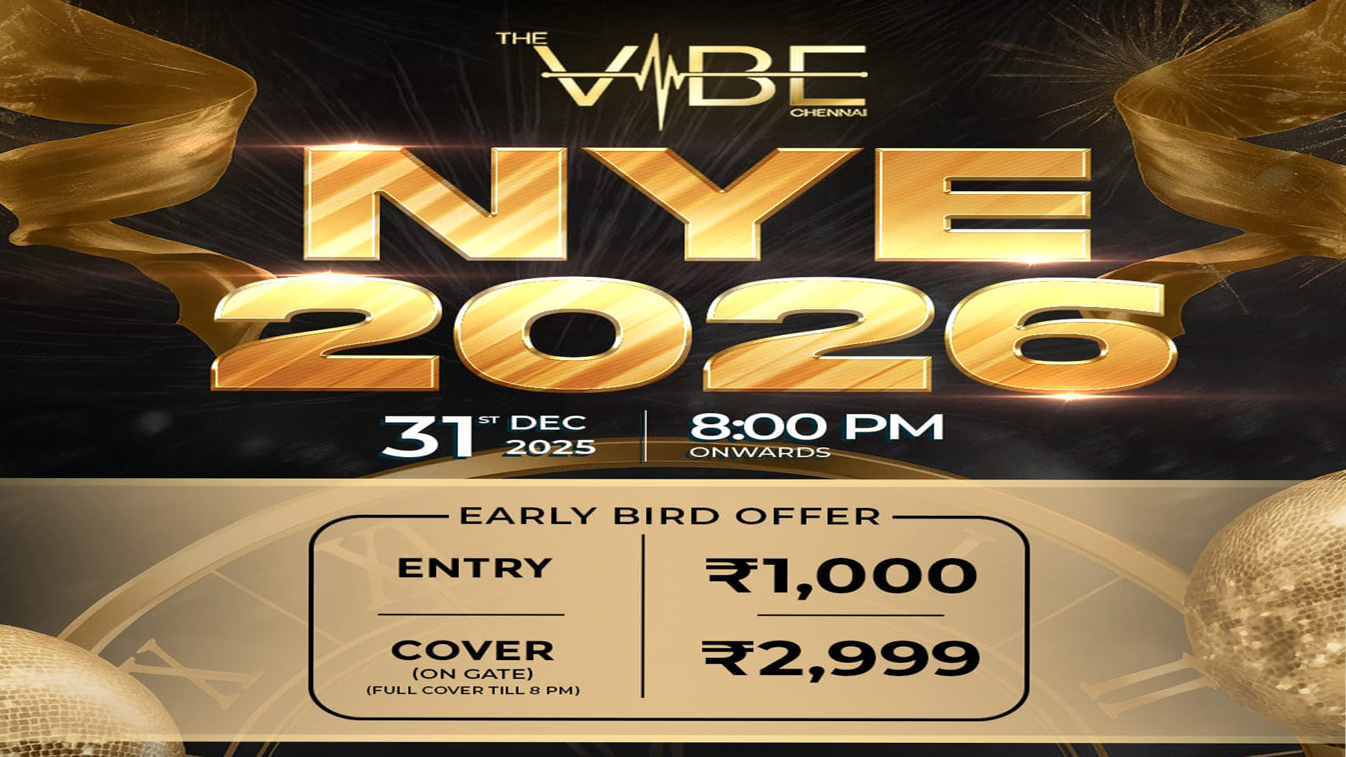 NYE 2026( NEW YEAR PARTY )Date: 31st Dec / Wed / 8pm onwardsVenue: VIBE RESTOBARFor More Details: 8866222751