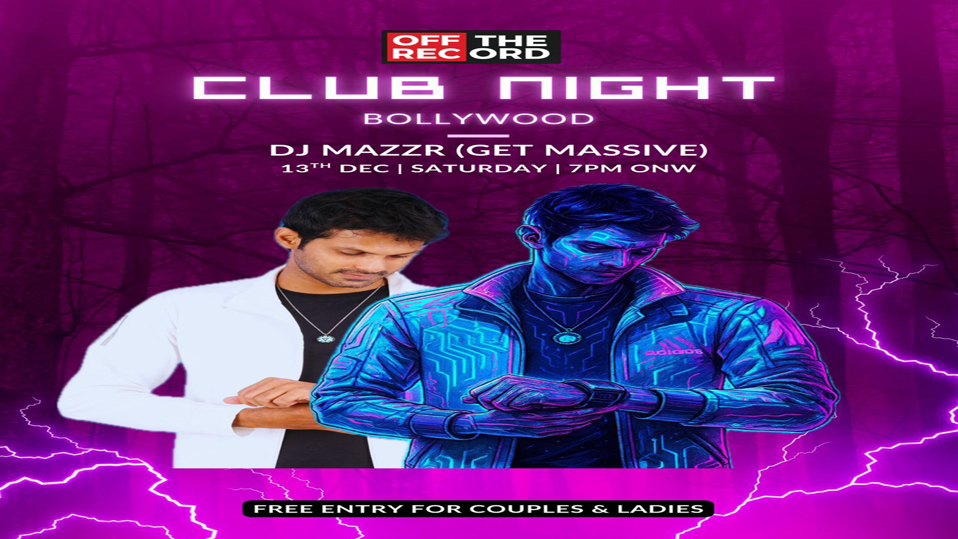 CLUB NIGHTDate: 13th Dec / Sat / 7pm onwardsVenue: OFF THE RECORDFeaturing: DJ MAZZR ( GET MASSIVE )Music: BOLLYWOODGirls walk-in freeCouples walk-in free on guestlist till 9pm( maybe cover charges apply on gates )For More Details: 8866222751