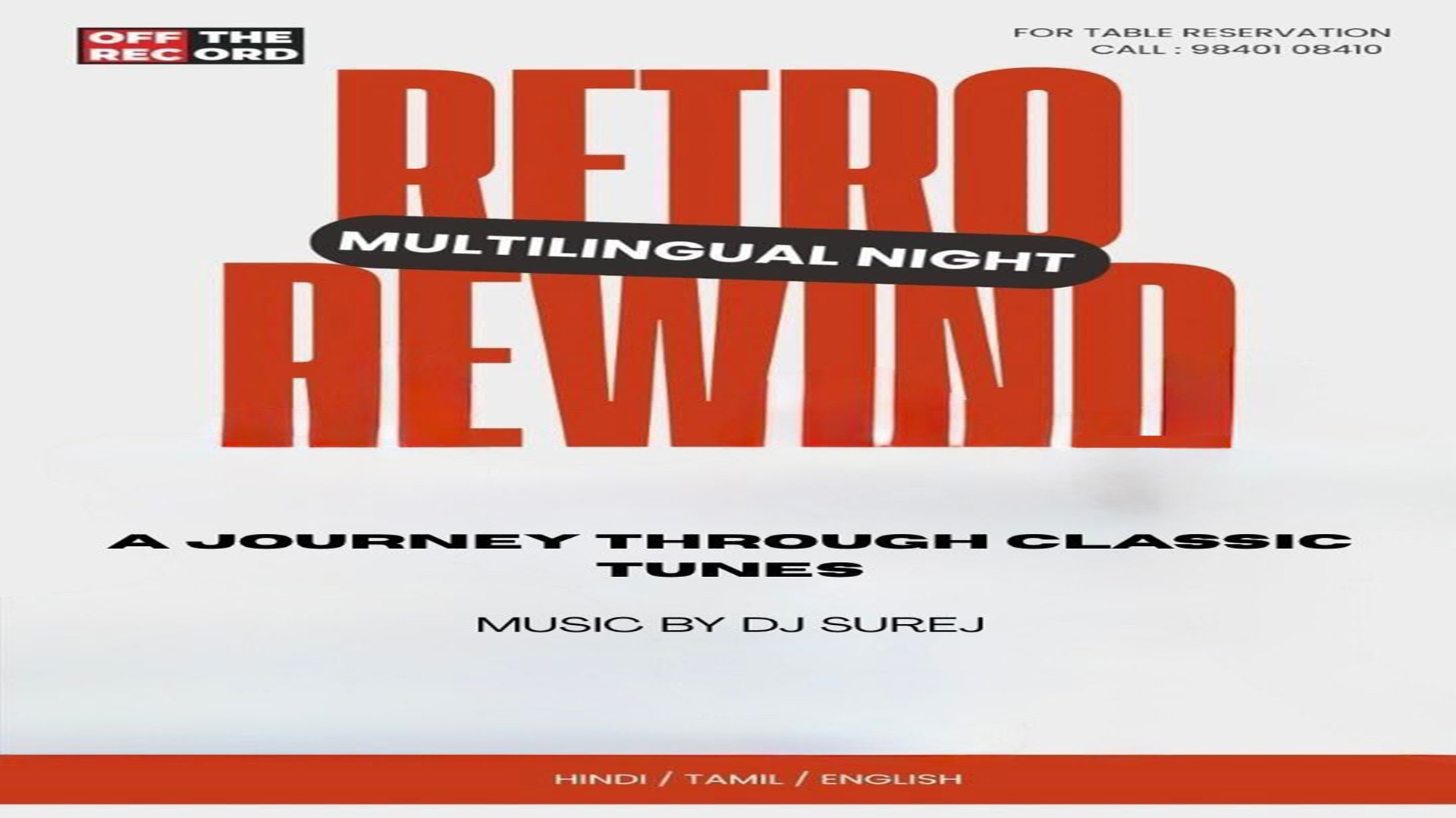 RETRO REWIND MULTINGUAL NIGHTDate: 14th Dec / Sun / 7pm onwardsVenue: OFF THE RECORDFeaturing: DJ SUREJMusic: HINDI / TAMIL / ENGLISHGirls walk-in freeCouples walk-in free on guestlist till 9pm( maybe cover charges apply on gates )For More Details: 8866222751