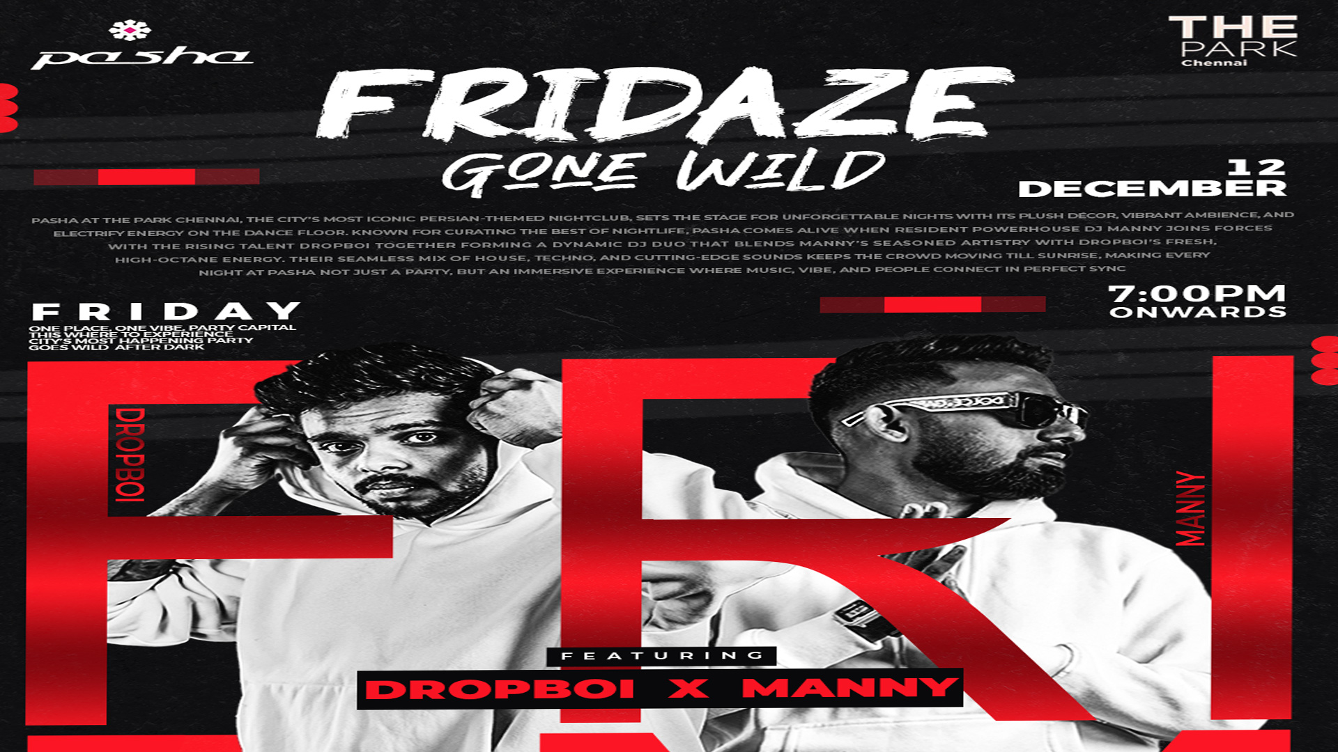 FRIDAZE GONE WILDDate: 12th Dec / Fri / 7pm onwardsVenue: PASHA THE PARKFeaturing: DROPBO! x DJ MANNYGirls walk-in freeCouples walk-in free on guestlist till 10pm( maybe cover charges apply on gates )For More Details: 8866222751