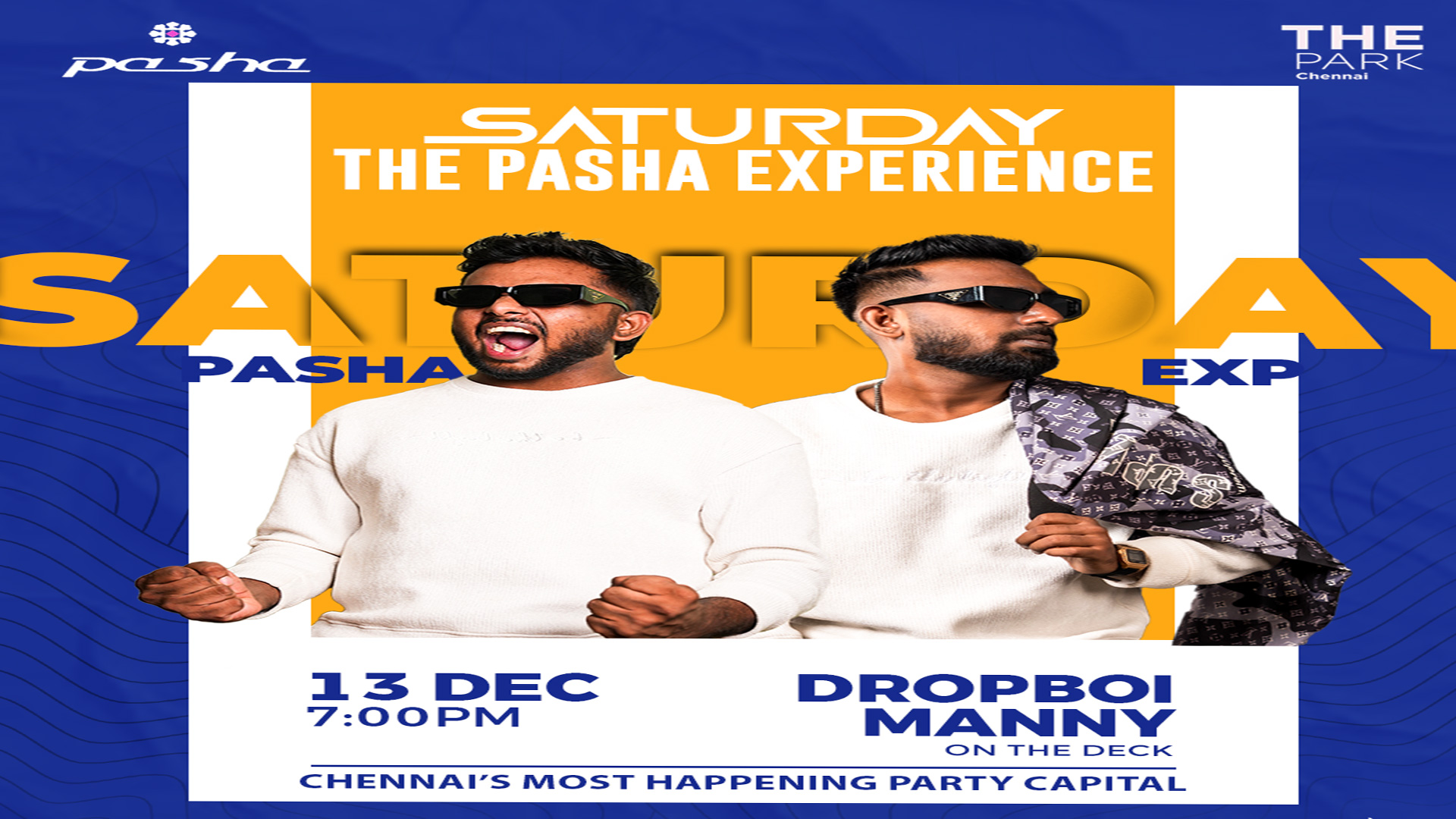 SATURDAY THE PASHA EXPERIENCEDate: 13th Dec / Sat / 7pm onwardsVenue: PASHA THE PARKFeaturing: DROPBO! x DJ MANNYGirls walk-in freeCouples walk-in free on guestlist till 10pm( maybe cover charges apply on gates )For More Details: 8866222751
